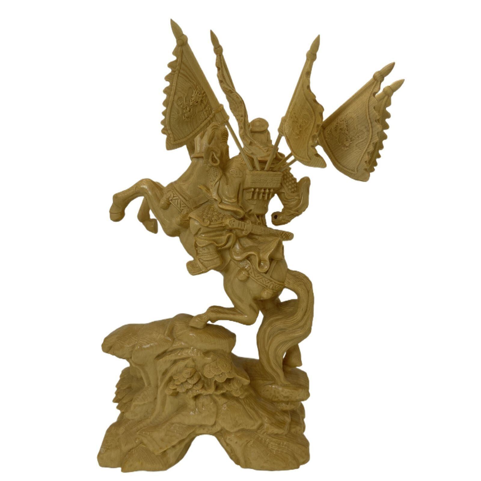 中国の歴史と伝説の中で重要な役割を果たす関羽をテーマにした美しい木製の彫刻です。関羽は、三国時代の名将として広く知られ、忠義と義理堅さの象徴として、また商売繁盛や家庭の守護神として崇められています。彼の勇敢さと正義感は、多くの人々に尊敬され、長い間信仰されてきました。