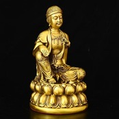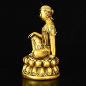 この優雅な坐像は、柔らかく微笑む表情と片膝を立てた「自在坐(遊戯坐)」の姿勢が特徴で、見る者に深い安心感と静けさを与えます。蓮花座に腰を下ろし、流れるような衣文(ころももん)の彫刻は、東洋的な美と精神性を感じさせる逸品です。