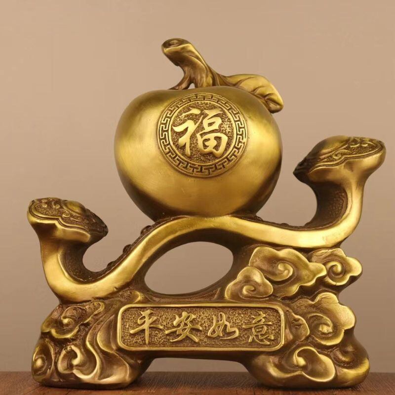 リンゴ りんご 置物 オブジェ 風水 インテリア 平安如意 銅製 福字 如意棒 金運 開運 財運 招福 家庭運 健康運 商売繁盛 成功運 飾り物 縁起物 吉祥物 プレゼント 贈答品 リビング 玄関 デスク 伝統彫刻 お守り 成就祈願 和合繁栄 金色 運勢アップ | 幸せの置場