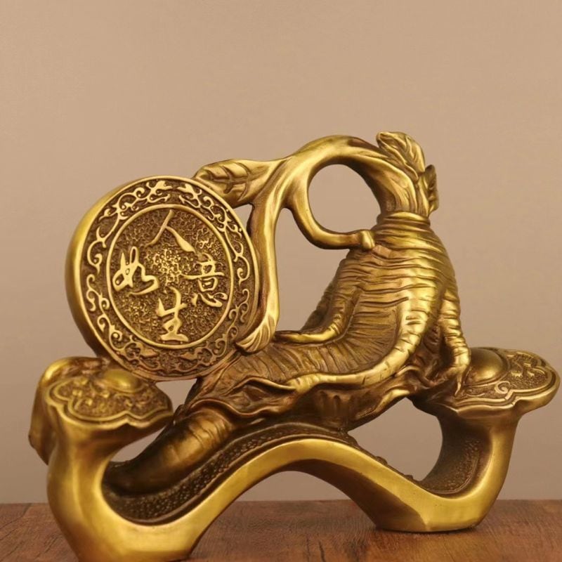 本品は、全体を黄銅で仕上げた重量感ある「人生如意」人参モチーフの縁起置物です。中国文化において長寿と繁栄の象徴である人参(朝鮮人参)と、すべてが思い通りになることを意味する「如意(にょい)」の形を組み合わせたデザインは、まさに吉祥と繁栄の願いが込められた一品です。