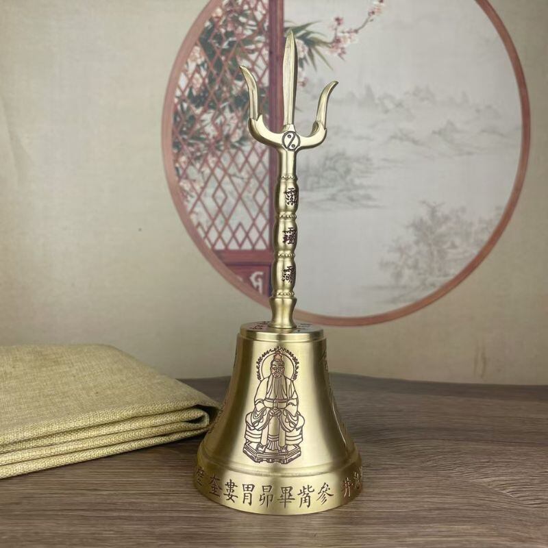 こちらの「三清鈴(さんせいれい)」は、道教の儀式で用いられる法器のひとつであり、黄銅製の重厚感と美しい響きを備えた三叉型の鈴鐺(すず)です。握り部分には道教で神聖視される文字や紋様が刻まれ、下部の鈴には三清尊(道教の最高神である玉清・上清・太清)の姿が刻印されているなど、細部にわたり精緻な意匠が施されています。