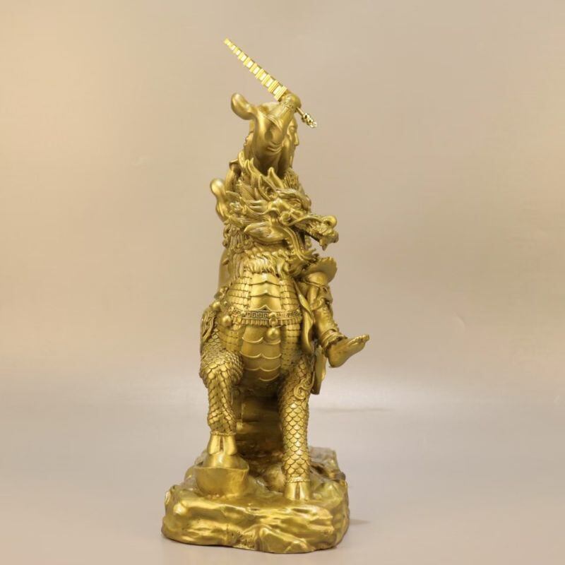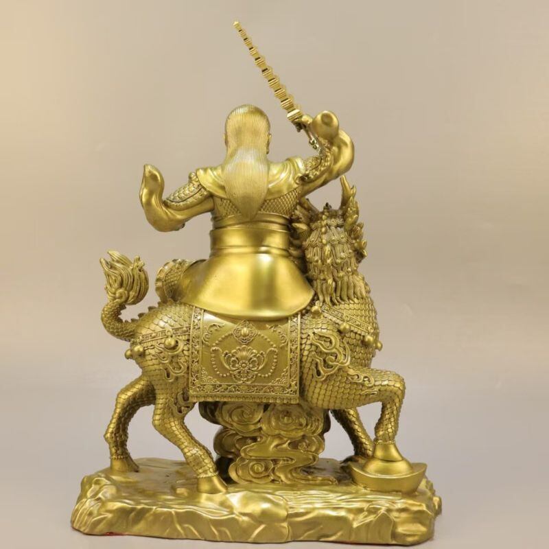 彫像は、龍を模した霊獣に騎乗し、右手には雷を象徴する稲妻型の剣を高く掲げた勇壮な姿。細部に至るまで精巧に造られており、その気迫に満ちた造形から、古来より人々の畏敬と信仰を集めてきた背景を感じさせます。道教においては、雷は「天の正義」の象徴であり、不浄なものを一掃する力のあるものと捉えられてきました。
