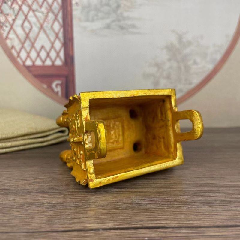 本品の側面には、伝統的な「饕餮(とうてつ)」とも呼ばれる獣面文が彫り込まれています。これは悪しき気を退け、福を招く力があるとされ、古来より風水の護符的役割も担ってきた図像です。香炉全体が金色に鎏(めっ)されており、「金」は五行において財を司る色。飾るだけでも財運上昇の気を引き寄せると信じられています。