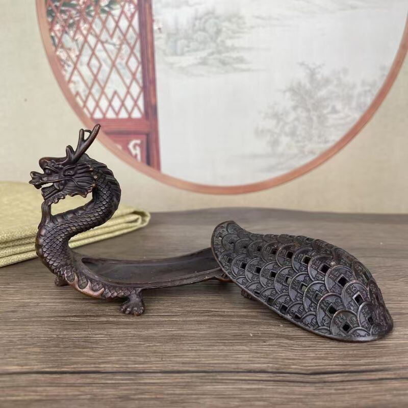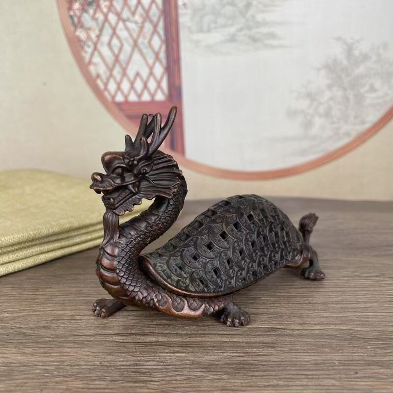 こちらの龍亀香炉は、重厚な銅素材に落ち着いた古銅調の仕上げが施され、まるで長い時を経た骨董品のような趣きを持ちます。香炉としての実用性はもちろん、置物としても圧倒的な存在感を放ち、空間に風格と神聖な雰囲気を与えてくれる逸品です。甲羅の部分は精巧な透かし彫りになっており、香を焚いた際にゆっくりと立ち上る煙が幻想的な情景を生み出します。