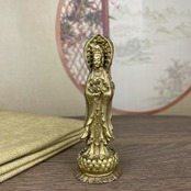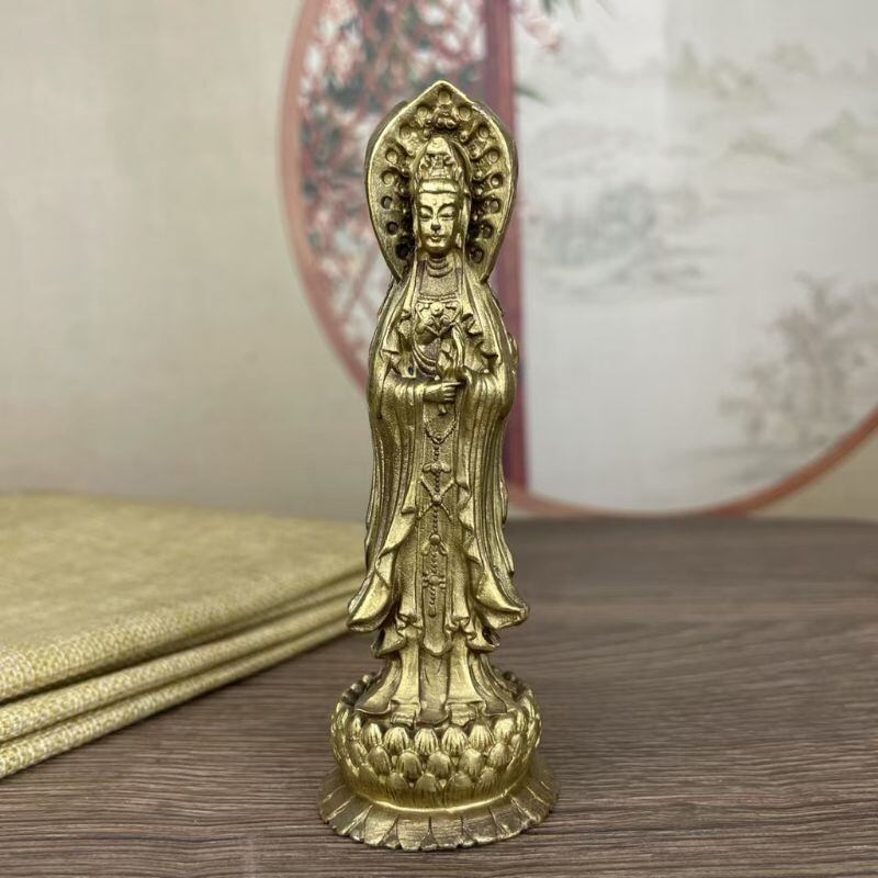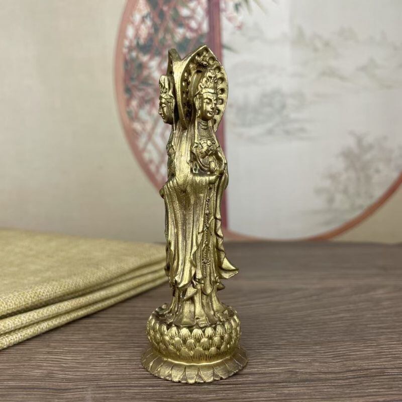 銅で作られた本品は、しっかりとした重量感と古色を帯びた落ち着いた輝きを持ち、時間の経過とともに味わい深さを増していく特徴があります。蓮華台に立つ姿は、煩悩を超越し、清浄な境地に立つことを象徴しています。手には蓮の花を携え、慈悲の心をもってあらゆる方角の人々を見守っているかのような印象を与えます。