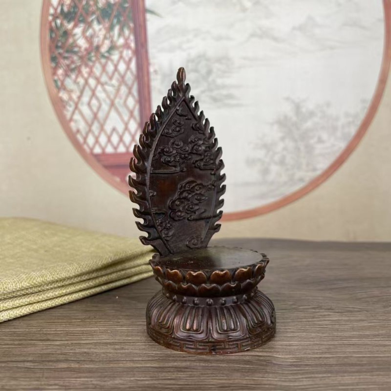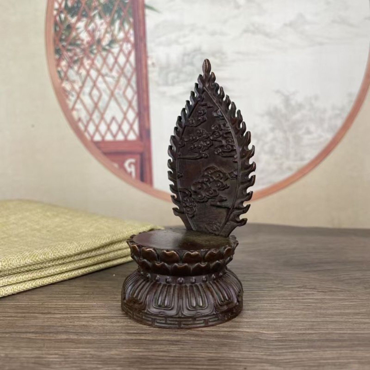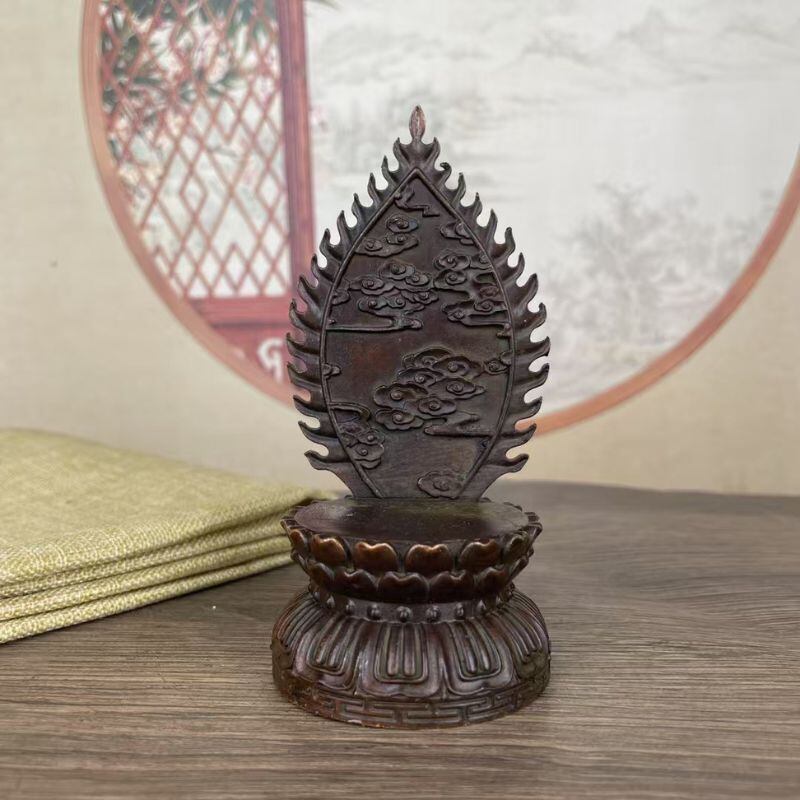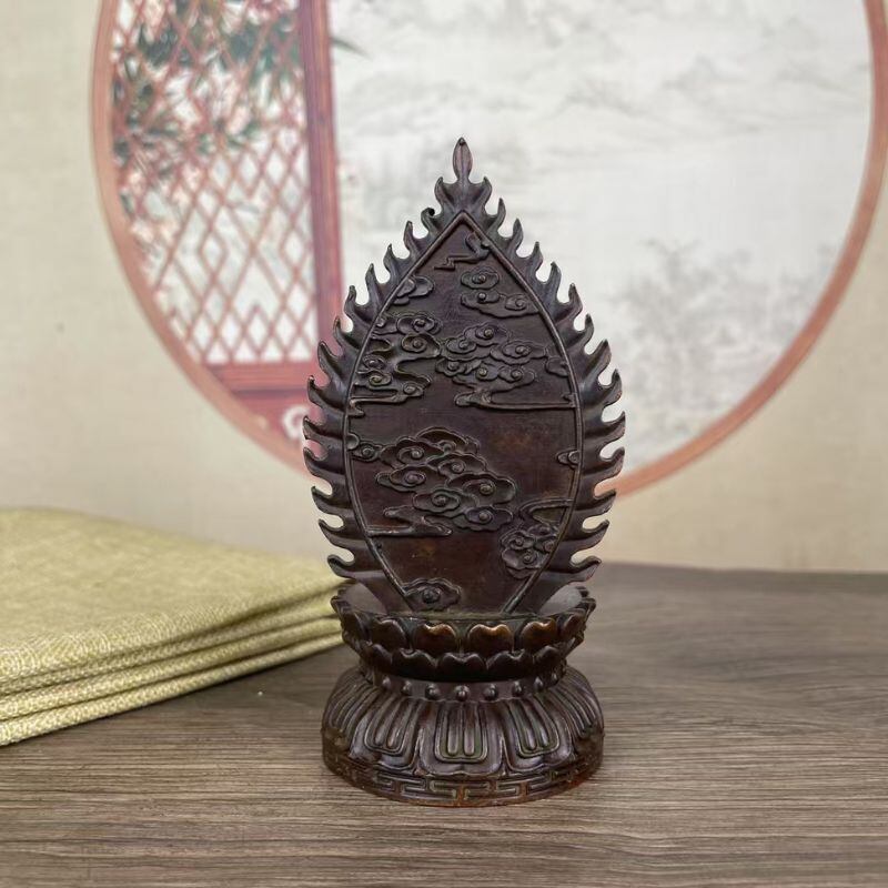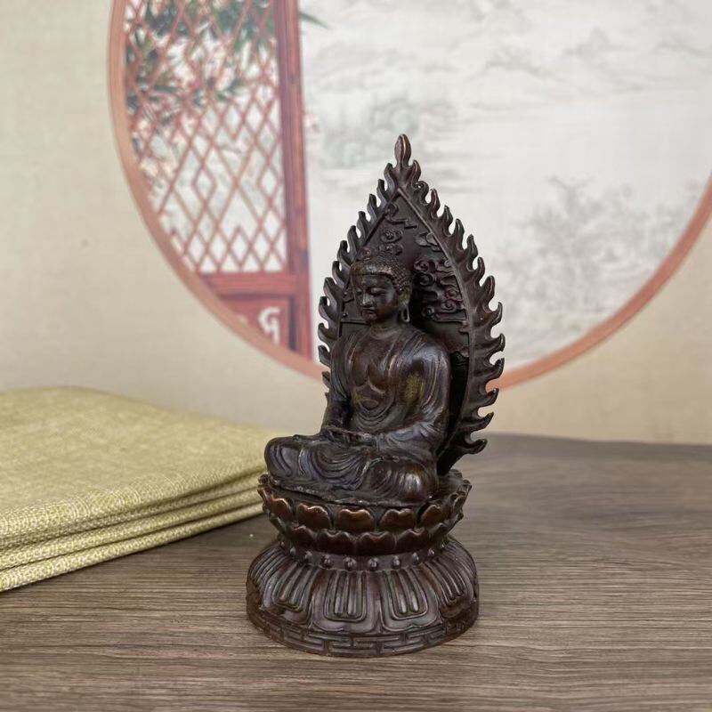 こちらの仏像は、静かに瞑想する釈迦牟尼(しゃかむに)の姿を模した合金銅製の仏具オブジェです。蓮華座に座る姿勢は、悟りに至った瞬間を象徴するとも伝えられ、背後の光背(こうはい)には雲や炎のような模様が彫り込まれ、精神的な守護や浄化をイメージさせます。