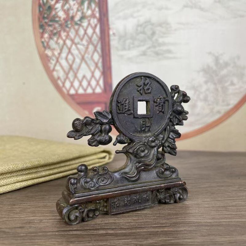この銅製の置物は、そうした縁起の良い古銭の意匠に加え、豊かさを実らせる植物のような曲線的な彫刻が融合されており、財が枝葉のように広がり実を結ぶ様子を連想させます。その佇まいからは、ただの装飾品以上の精神的な意味合いが感じられるかもしれません。