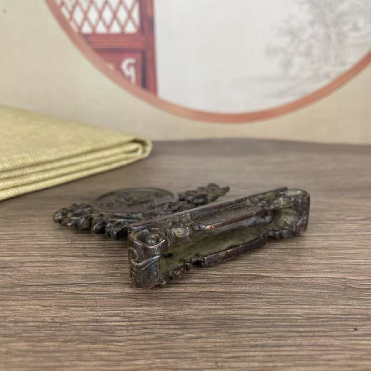 古銭を象ったこの置物は、財運を象徴するモチーフとして、古くから人々の信仰や暮らしの中に息づいてきた意匠を再現しています。特に中央に配された「方孔円銭(ほうこうえんせん)」と呼ばれる形状は、古代中国において最も広く用いられた貨幣であり、円形の外枠は「天」、中央の四角い穴は「地」を意味するとされ、「天地の調和」「宇宙の秩序」を象徴していると伝えられています。