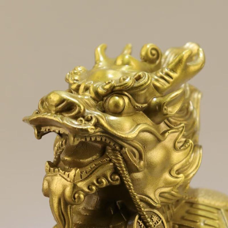 この一体は、純銅素材を使用し、重厚でありながらも艶やかな黄金色の仕上がりとなっており、風格と品格を兼ね備えた逸品です。細部の鱗や爪の表現、口元の造形、背中の八卦模様まで、細密な彫刻技術により力強く生命感のある姿に仕上げられています。
