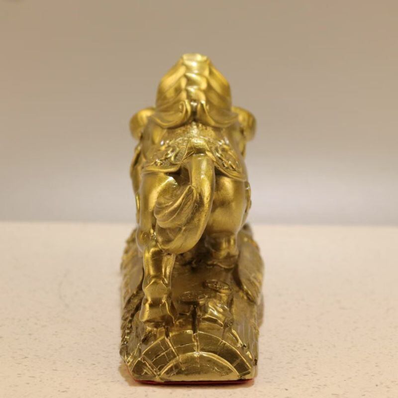 そのどっしりとした佇まいと、低く頭を下げるポーズには、着実に成功を積み重ねていく堅実さや、努力が実を結ぶというメッセージが込められているかもしれません。細部まで丁寧に施された模様や重厚感のある金色の輝きは、見る人に力強さと高級感を感じさせ、空間の格をぐっと引き上げてくれる存在感を放ちます。