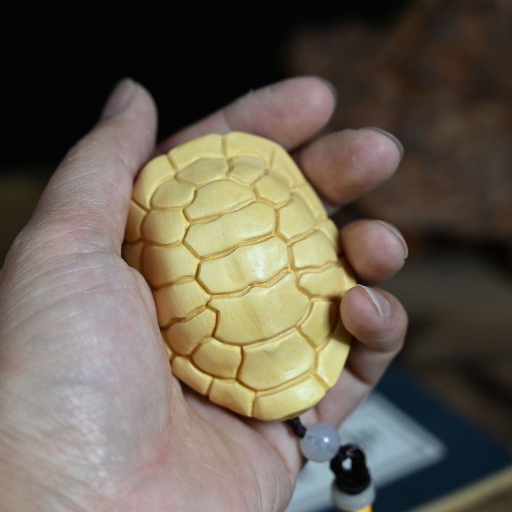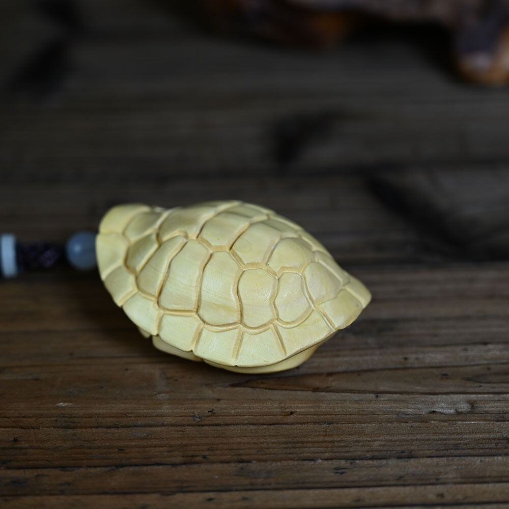 木製で精巧に作られた亀の形をしたペンダントです。亀は古来より長寿や繁栄を象徴する動物として、多くの文化や信仰において尊ばれてきました。特に、亀は「不老不死」や「健康」「安定」といった良い運を招くと信じられ、長い時間をかけてその価値が受け継がれています。