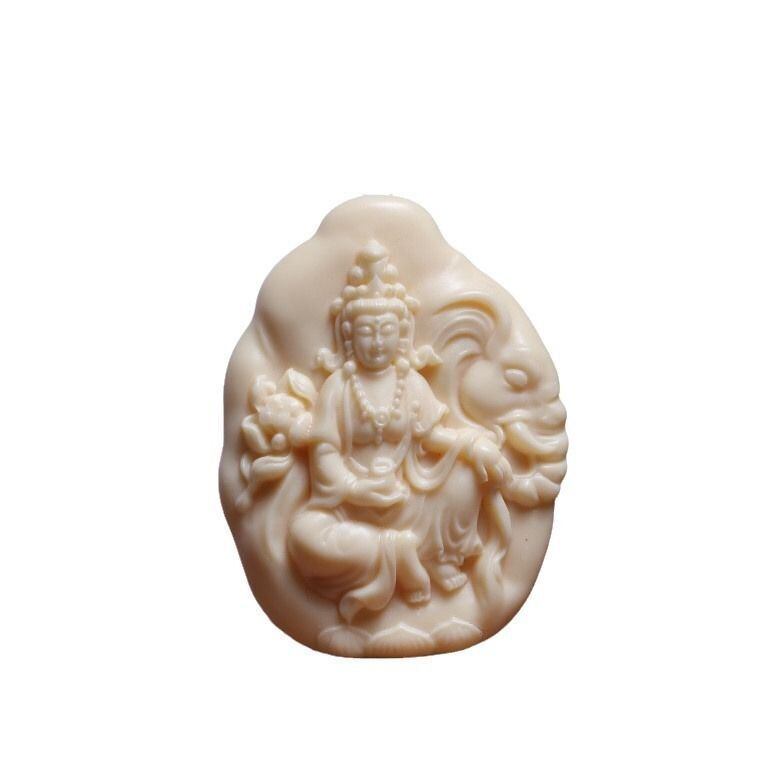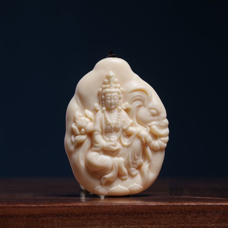 象牙果(ゾウゲカ)は、実際には象牙に似た天然の果実で、その色合いと質感が非常に高級感を醸し出します。このペンダントは、象牙果の美しい輝きと観音菩薩の精神的な力を融合させたデザインとなっており、身につけることで、日常の中で精神的な支えを得られると信じられています。