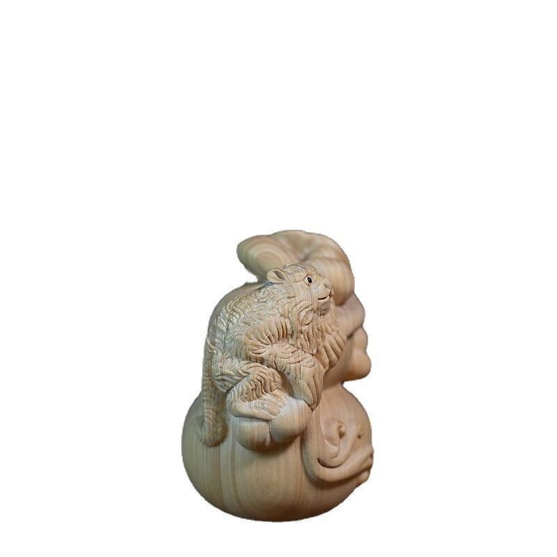 この木製のミニ置物は、猿が瓢箪に乗っているユニークなデザインが特徴です。猿は、古くから日本や中国をはじめとするアジアの文化で重要な存在とされ、特に「繁栄」や「知恵」の象徴として信仰されてきました。瓢箪は、福を呼び込むとされる縁起の良いアイテムとして広く親しまれており、幸運や富を象徴すると考えられています。