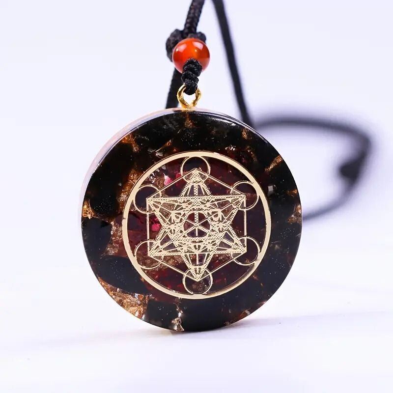 このペンダントは、天然石を使ったオルゴナイトの特性を持ち、周囲のネガティブなエネルギーを吸収し、ポジティブなエネルギーに変換する作用があるとされてきました。オルゴナイトは、心の平穏を保ち、ストレスを和らげる効果があると信じられており、日々の生活におけるバランスを整え、前向きな気持ちをサポートしてくれるかもしれません。魔法陣が持つ神秘的な力と、天然石のエネルギーが調和することで、日常生活の中で良い変化を引き寄せる手助けとなるでしょう。