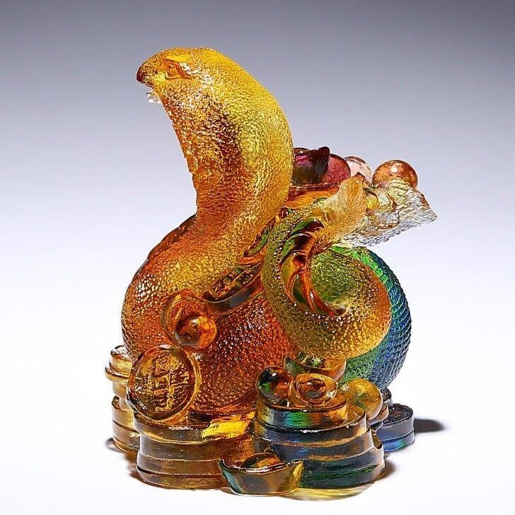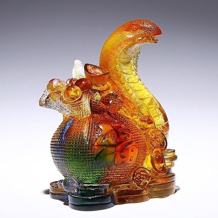 鮮やかな色彩と繊細なガラス細工が目を引く、美しいインテリアアイテムです。蛇は多くの文化で特別な象徴として位置づけられています。知恵、再生、そして変化を表す存在として信仰され、特に風水においては「変革の象徴」や「繁栄を導く力」として注目されています。