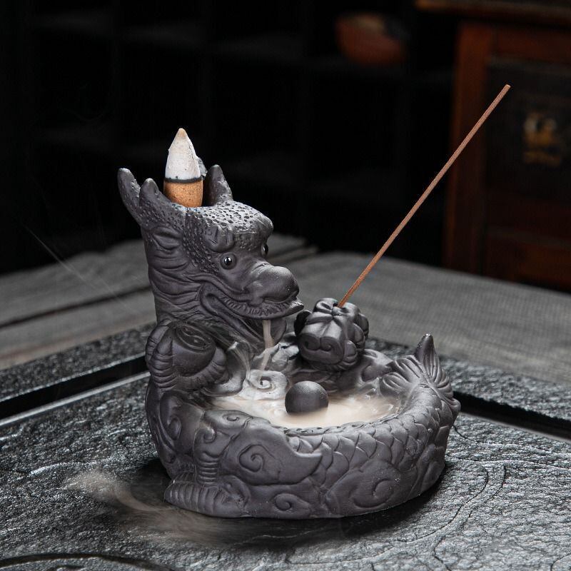 この香炉のデザインは、伝統的な龍の姿を現代的にアレンジしたもので、シンプルながらも力強さを感じさせるモダンな印象を与えます。逆流香炉として、煙が龍の背を流れ落ちる様子は、運気の流れが絶え間なく循環し、家や仕事場に安定した繁栄をもたらすとされています。この香炉を飾ることで、視覚的に美しいインテリアを楽しむとともに、風水の力を日常に取り入れることができます。