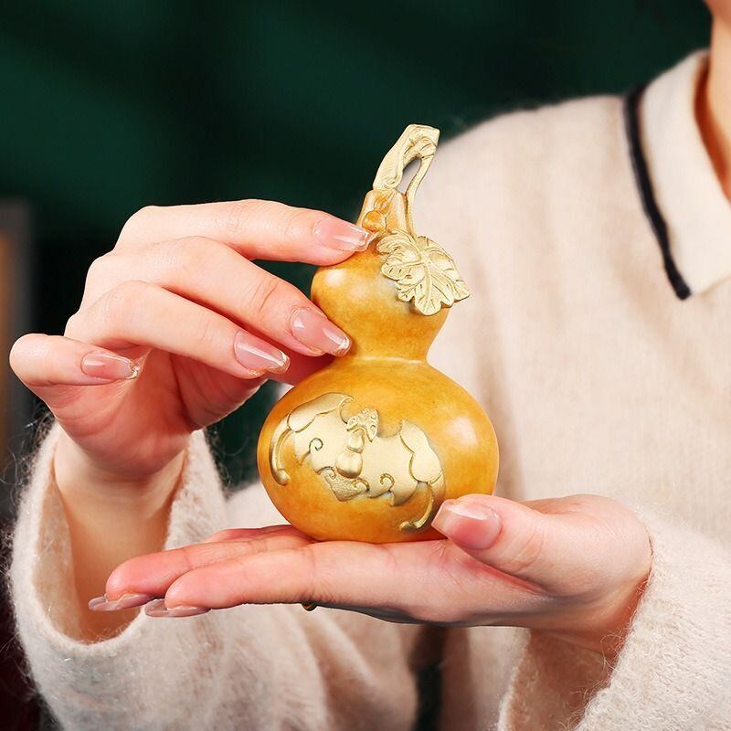 古来より縁起物として重宝されてきた、瓢箪の形をした銅製の美しい置物です。瓢箪は、風水や民間信仰において、特に「福を呼ぶ」「邪気を祓う」「繁栄をもたらす」と信じられており、古くから幸福や健康を願う象徴として飾られてきました。瓢箪は、特にその形状が「実る」「豊かさをもたらす」という意味を持ち、商売繁盛や家庭の調和を願う方々に人気があります。