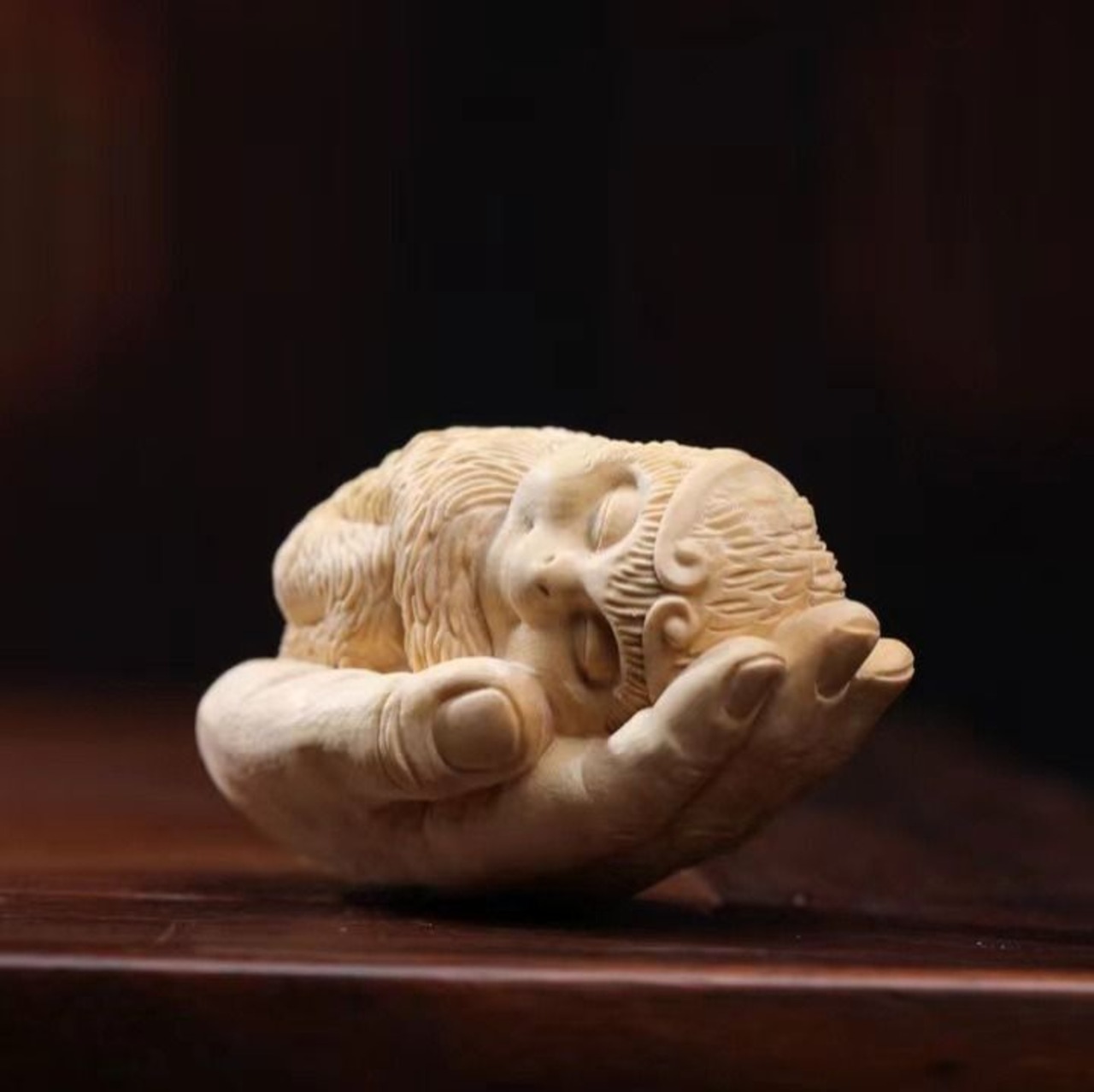 この置物は、孫悟空の特徴的な姿を温かみのある木製で精緻に彫刻したオブジェです。手のひらで寝ている姿が印象的で、どこか親しみやすく、優しさを感じさせます。彼の愛らしい姿は、見る者に癒しのエネルギーをもたらし、日々の忙しさやストレスから解放されるひとときを提供してくれるでしょう。