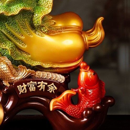 このオブジェは、白菜と鯉が組み合わさることで、財運向上や成功への願いを込めたデザインになっています。風水の考えでは、このようなモチーフを飾ることで、良いエネルギーを引き寄せると信じられています。特にリビングやオフィスの目立つ場所に飾ると、空間を明るく彩り、運気を上げる助けになるともいわれています。
