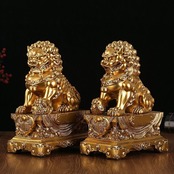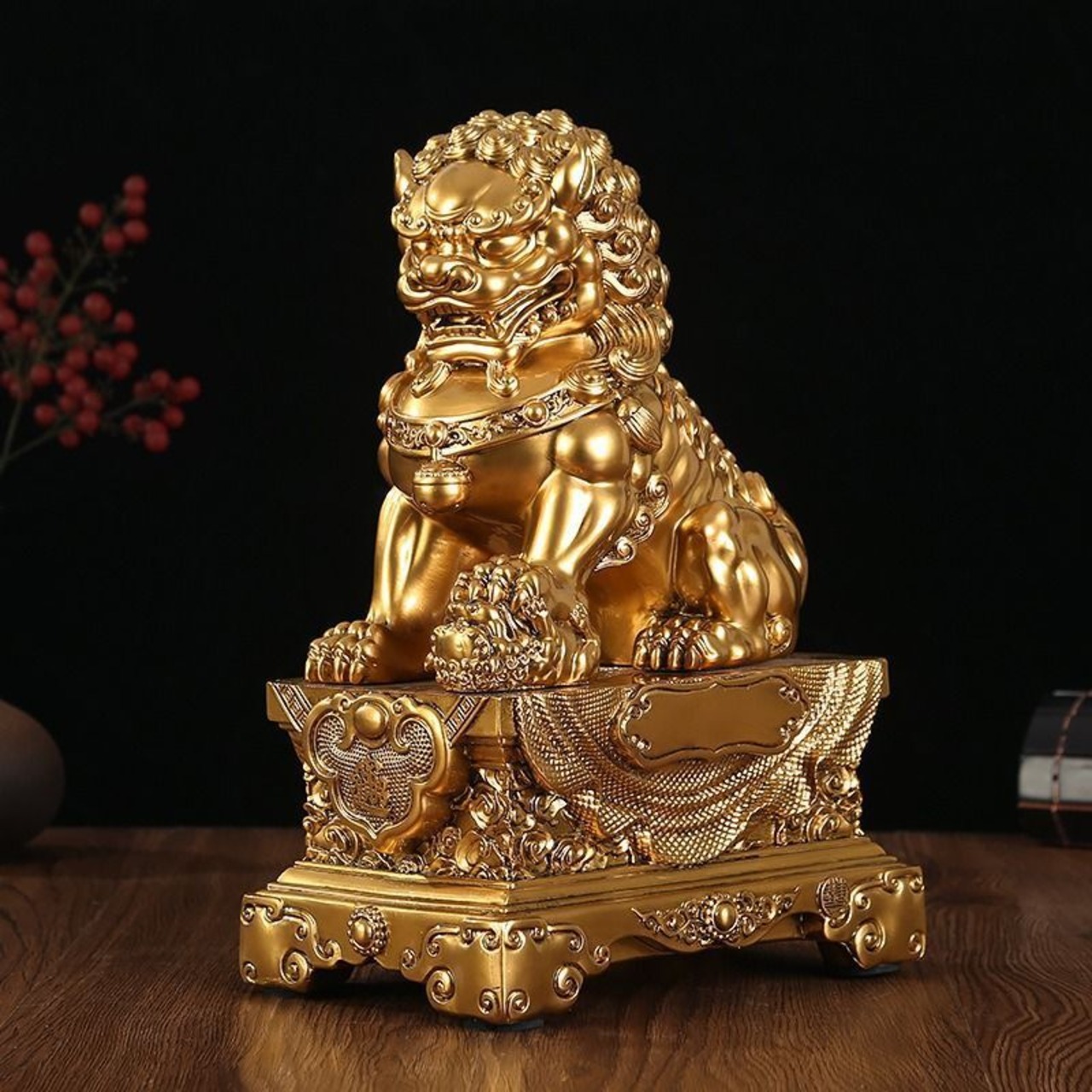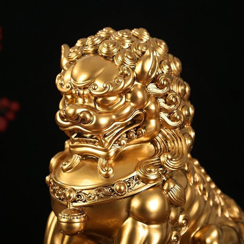 獅子は、古代から世界中の多くの文化や信仰において、力強さと守護を象徴する存在とされています。特に風水においては、獅子は「獅子の門」を守る存在として家庭や商売繁盛をサポートすると信じられています。この金色の獅子の置物は、豪華で威厳のあるデザインが特徴で、家やオフィスに飾ることで、ポジティブなエネルギーと幸運をもたらすと考えられています。
