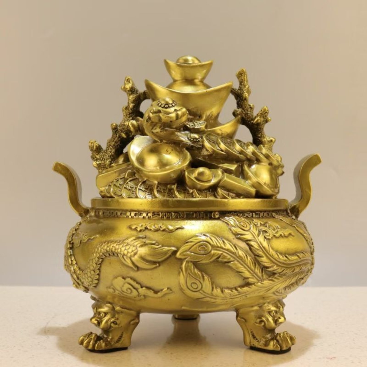古来中国において「聚宝盆(じゅほうぼん)」は、財宝が尽きることなく集まるとされる伝説の器として語り継がれてきました。こちらの置物は、その聚宝盆の形を模した純銅製の香炉型財運アイテムです。蓋の上には古銭・元宝・金塊が山のように積まれ、金蟾(銭蛙)や龍鳳の意匠が施されており、財を招くと同時に悪運を祓い、空間を清める力があるとされています。