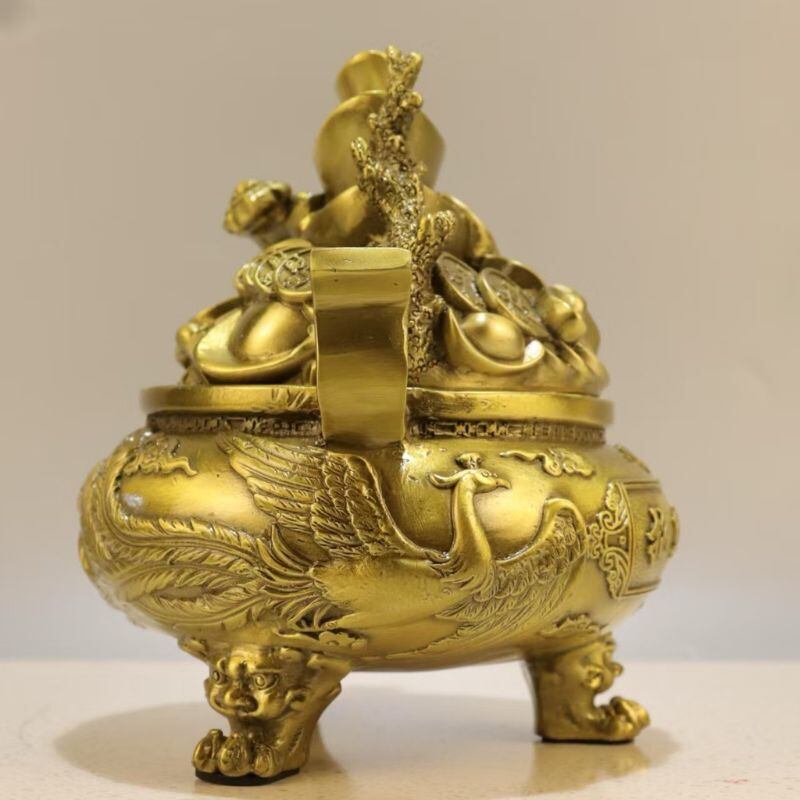 本体側面には「招財進寳(しょうざいしんぽう)」の文字が堂々と刻まれ、文字通り“財を招き、富を迎える”願いが込められています。さらに、香炉としても機能する設計になっており、実際にお香を焚いて清浄な香りとともに空間の浄化を行うことも可能です。ビジネス運や商売繁盛を願う場面では、店舗や会社の入口、レジ横、事務机の上などに置くことで、訪れるお客様との縁を育み、商機の巡りを良くすると考えられています。