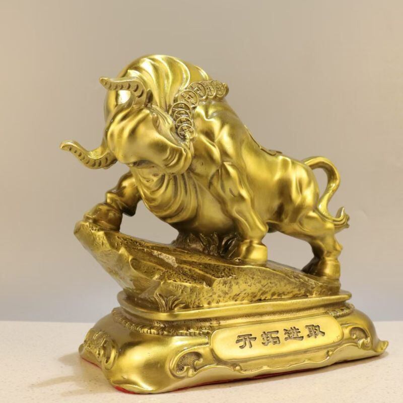 堂々たる立ち姿で前方を見据えるこの「黄銅製・開拓進取牛」は、力強く逞しい牛の姿を通じて、“困難を乗り越えて道を切り開く”という精神を象徴した風水置物です。牛は中国の十二支において「丑」にあたり、誠実さや勤勉さを象徴するとともに、努力の果てに実りを得る吉祥の存在とされています。
