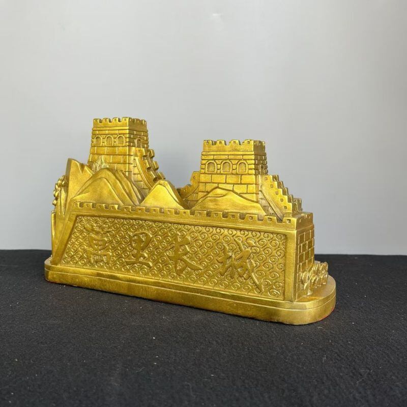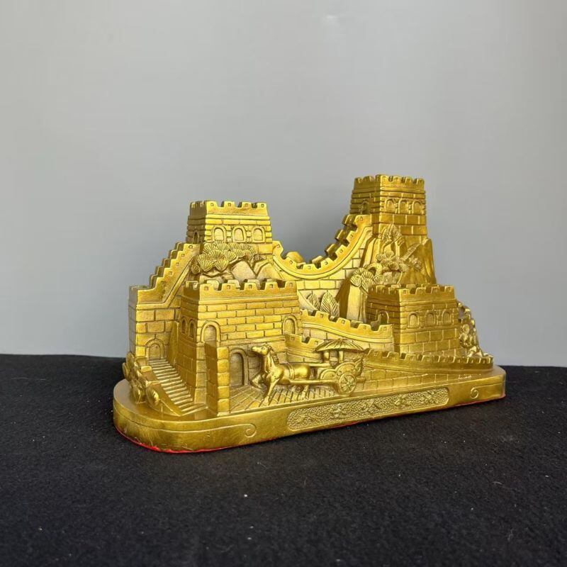 中国の悠久の歴史と精神を象徴する「万里の長城」を模した本品は、重厚な黄銅素材で精巧に鋳造された高級インテリア置物です。実物の長城を彷彿とさせる精緻なディテールで、城壁のうねりや砦、山岳の風景、さらには古代の馬車までを立体的に表現し、見る者に圧倒的な存在感と歴史の重みを伝えます。手に取ればそのずっしりとした重量と冷ややかな金属の質感が、まさに「真鍮工芸の粋」と言える逸品です。