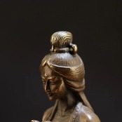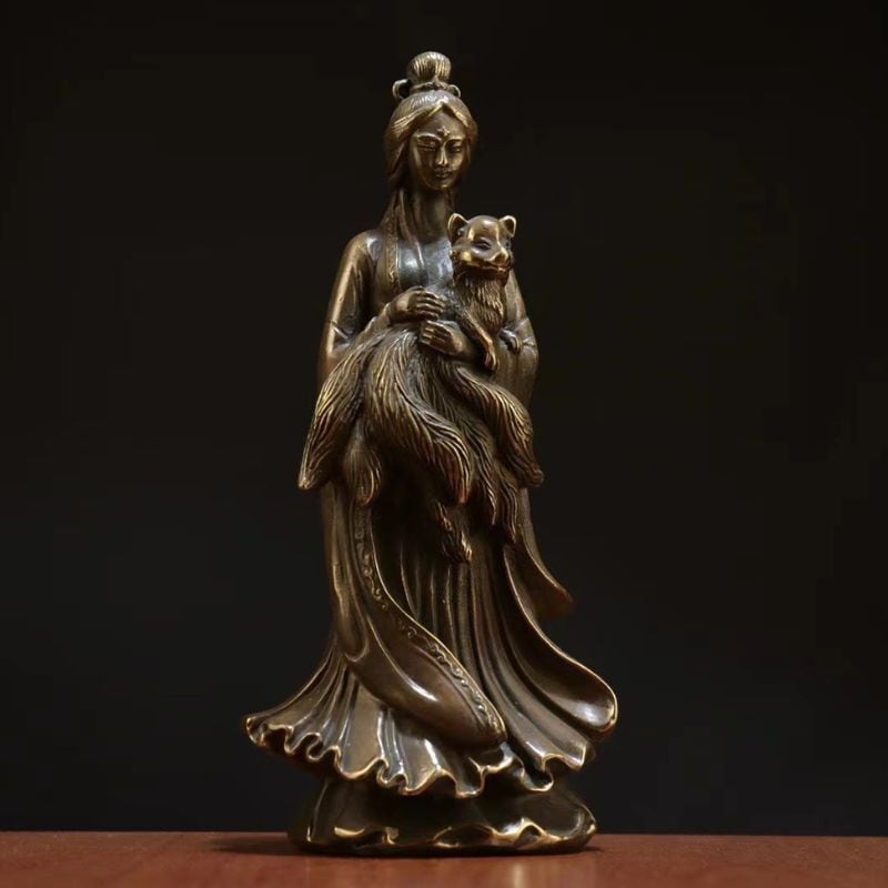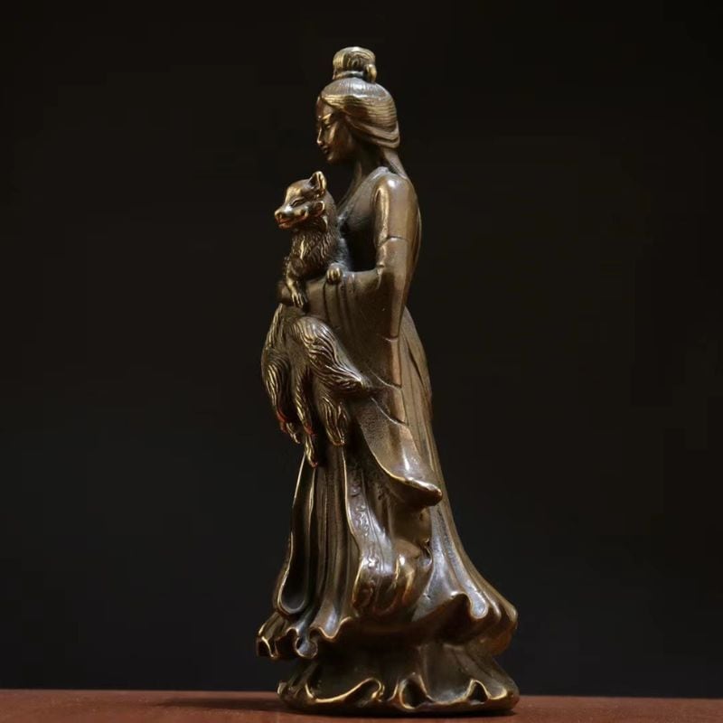 こちらは中国神話や道教に登場する霊獣「九尾狐(きゅうびのきつね)」を女性神の姿で表現した、真鍮製の美しい置物です。九尾狐は九本の尾を持ち、強力な霊力と知性、美しさを兼ね備えた存在として、古代中国から多くの信仰と伝承が受け継がれてきました。特に、九尾は天に属する瑞獣とされ、皇族や貴人の守護獣、あるいは神の使いとして尊ばれてきた歴史があります。