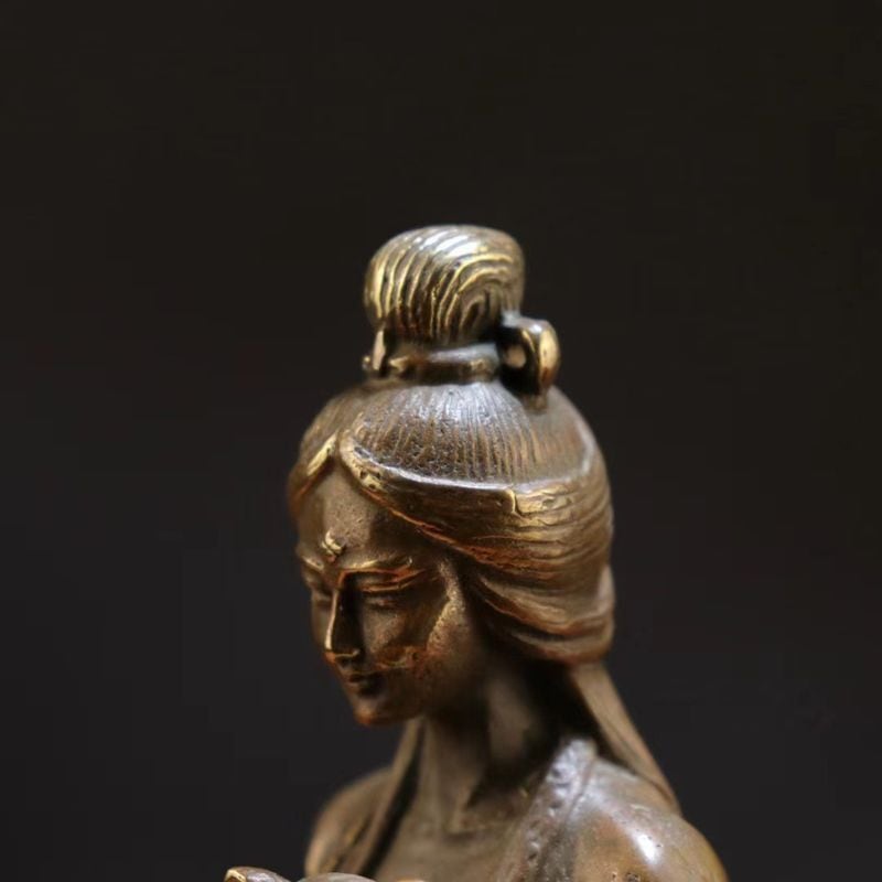 この置物は、しなやかにたなびく衣や九本の尾、穏やかで神秘的な表情など、細部にまで職人のこだわりが感じられる逸品です。素材は重厚感のある真鍮を使用し、時間とともに風合いが深まり、空間に静かな存在感をもたらします。伝統的な信仰に基づいたデザインでありながら、現代のインテリアにも自然に溶け込むよう工夫されています。