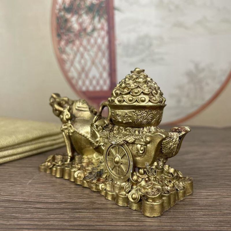 こちらは、力強く宝車を引く「金牛(きんぎゅう)」が主役の縁起置物です。純黄銅で作られたこの作品は、「財を引き寄せ、家に富をもたらす」と信じられており、古くから中国風水における招財吉祥物の一つとして親しまれてきました。