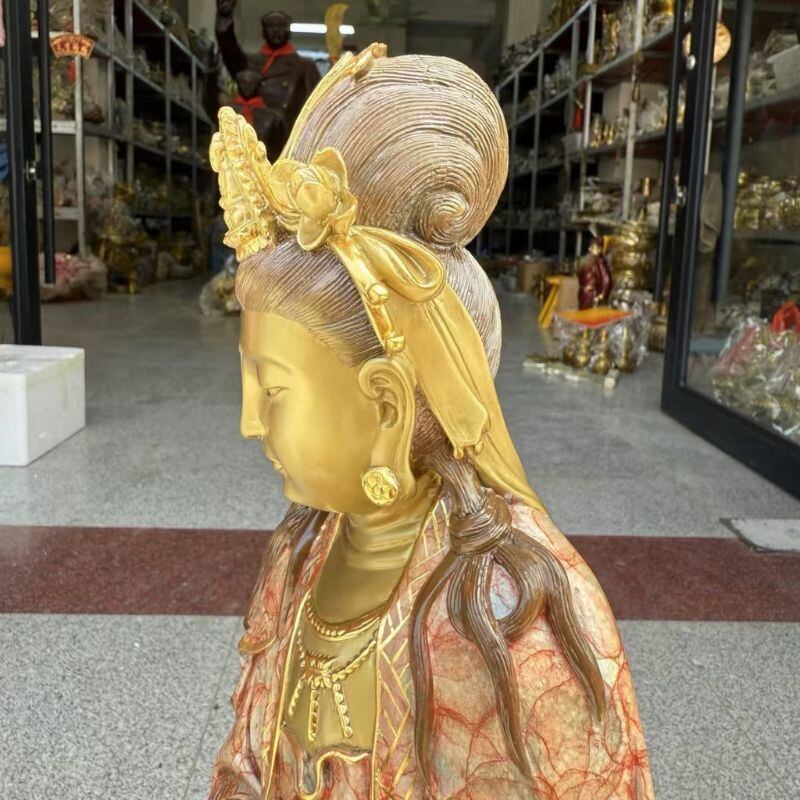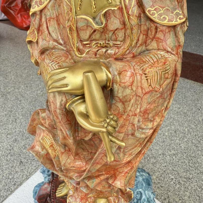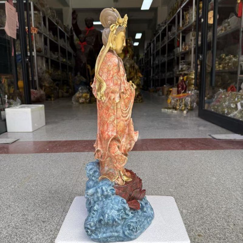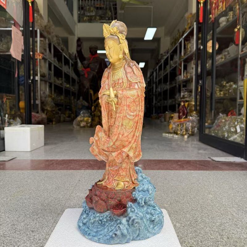 この立像は、細やかな彫刻と美しい造形により、観音菩薩の優雅さと神聖さを余すことなく表現しています。風に舞うような衣の流れ、やわらかな表情、蓮台の上に立つ姿勢には、職人の高度な技術と信仰心が込められているようにも感じられます。赤や青のグラデーションが重なる熱着色によって、立体感と荘厳さが一層引き立ち、空間に静かな存在感を放ちます。