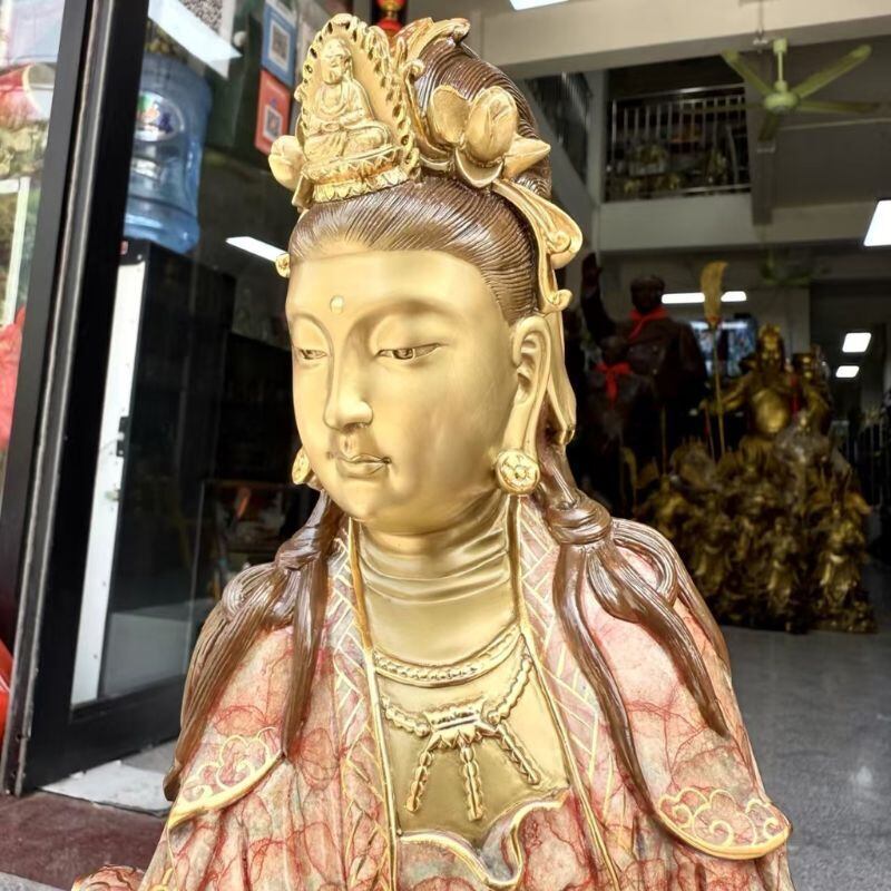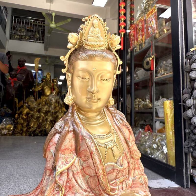 本商品は、台湾製の純銅製観音菩薩立像で、伝統的な技法「熱着色」によって色彩が施された希少な一体です。観音菩薩は古来より、慈悲と救済を象徴する存在として仏教信仰の中心に位置づけられており、人々の苦しみや不安に耳を傾け、安心と調和をもたらす存在として知られています。