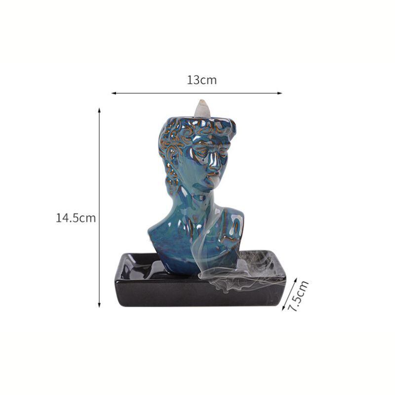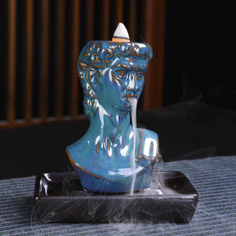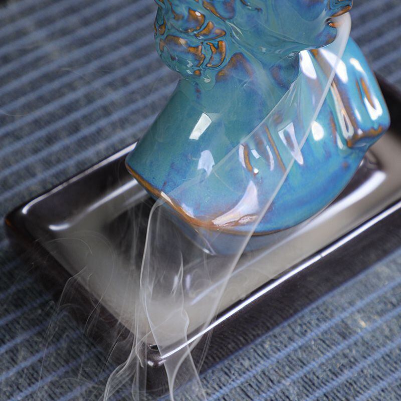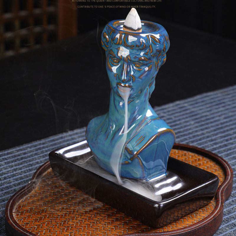 この倒流香炉は、ヨーロッパの古典的彫像をモチーフにした美しいビジュアルと、流れる煙が織りなす幻想的な演出が特徴のアロマ香炉です。滑らかな青釉の陶器製で、光沢のある表面が高級感を演出し、洗練されたインテリアとして空間にアクセントを加えることができそうです。