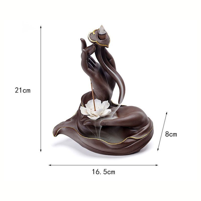 静かに手を差し出す仏の掌から流れる煙と、掌に咲く白蓮の花が目を引くこちらの倒流香炉は、禅意あふれる空間を演出するためにデザインされたインテリア香炉です。落ち着いた紫砂色の本体に、優美に造形された仏手と清らかな白蓮が対比をなし、空間に静寂と安らぎをもたらしてくれるかもしれません。
