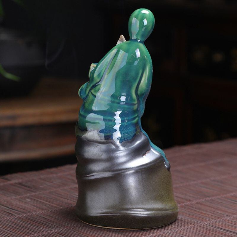 この「倒流香炉」は、静かに本を読む人物をモチーフにした独特なデザインが特徴的です。本を読む姿は、知恵、静けさ、集中を象徴し、心の安定とリラックスを促進するアイテムです。風水では、書物や学びは「知恵」や「成長」を象徴し、この香炉が持つシンボリックな意味が空間にポジティブなエネルギーをもたらします。