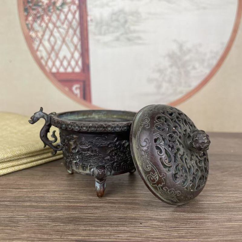 古の格式と風水的な吉祥の象徴が融合した、重厚感あふれる仿古銅製香薰炉です。丁寧に施されたアンティーク調の仕上げは、まるで時代を超えて伝わる宝物のような趣を持ち、空間に威厳と品格をもたらします。