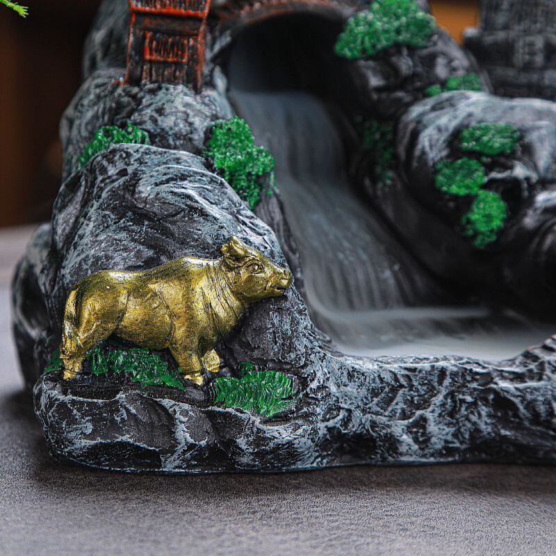 まるで山水画から抜け出たような美しい情景をそのまま形にした、高山流水モチーフの倒流香炉。山、川、橋、楼閣、そして金色の牛――見る者の心を静め、空間に癒しの風を運ぶアートピースのような香炉です。