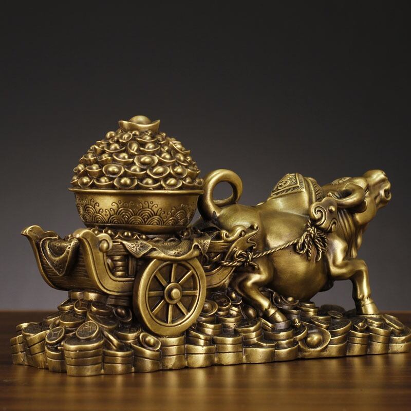 繁栄と財運を象徴する風水アイテムです。このオブジェに描かれる牛は、誠実さや堅実さを象徴し、中国文化や風水では長く豊穣と安定の象徴とされてきました。運ばれている元宝の山は、富と成功を象徴するモチーフで、金運や事業運を高めると信じられています。