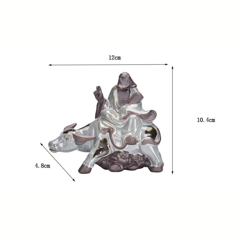 古代中国の偉大な思想家・老子が、悠然と牛に乗る姿を描いた陶磁器置物です。老子は「道徳経」の著者として知られ、自然と調和し、心静かに生きる知恵を説いた人物。その穏やかな表情とゆったりとした姿は、見る人の心を落ち着かせ、空間に静謐な気配をもたらします。