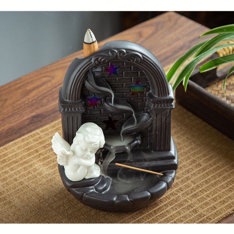 優しい光と香りが心を包み込む「欧式丘比特倒流香炉」は、ヨーロッパ神話の愛の天使・丘比特をモチーフにした、可憐で上品な香炉です。バックフロー式のお香を焚くと、白い煙が静かに下へと流れ落ち、小さな滝や雲海のような景色を作り出します。LEDライトの柔らかな輝きがその流れを照らし、まるで天上から降り注ぐ祝福のような幻想的な空間を生み出します。