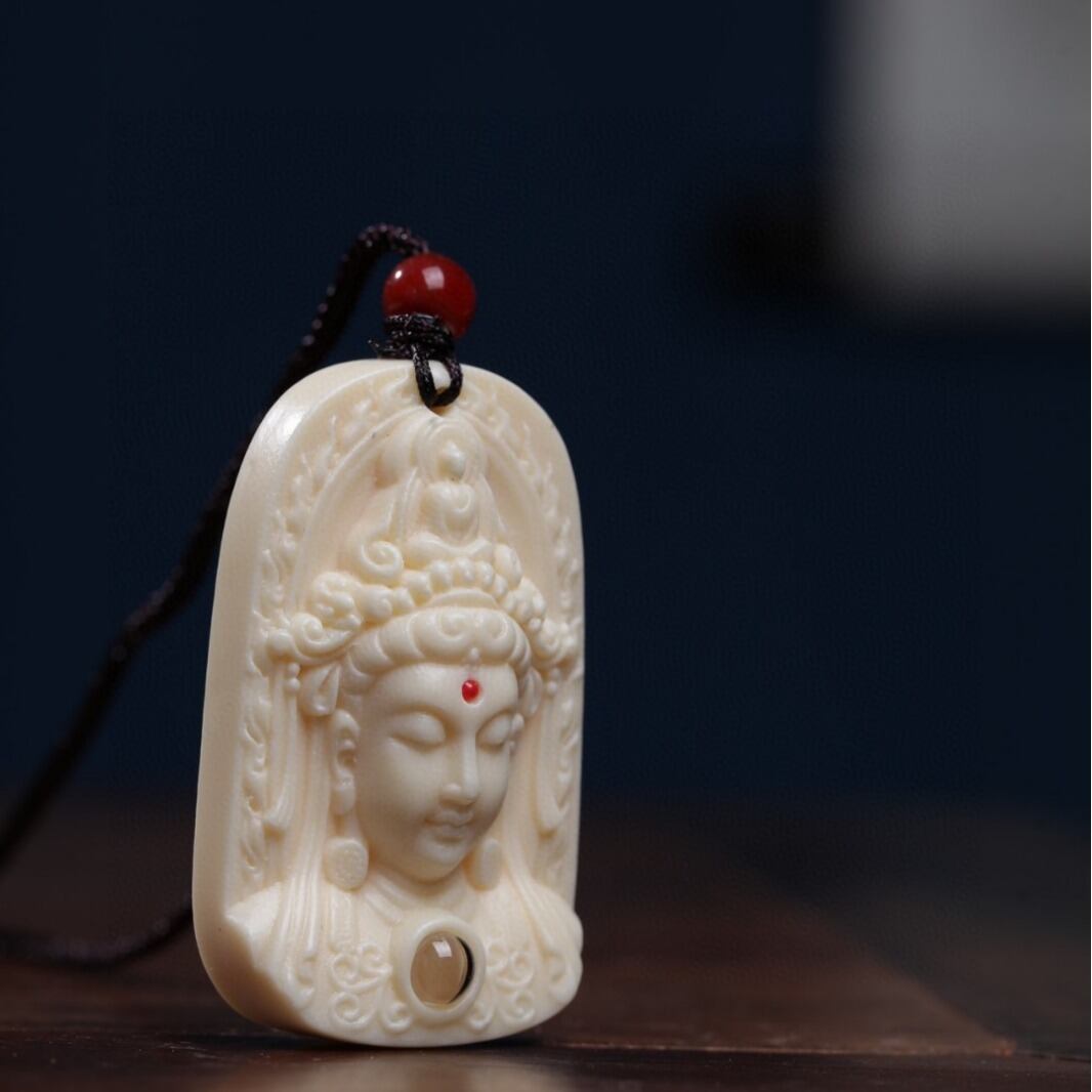 象牙果は、自然の恵みが宿る素材であり、古来より神聖視されてきました。その質感や色合いは、身に着けることで穏やかなエネルギーを感じさせ、日常の中で癒しや落ち着きをもたらすと信じられています。このペンダントは、観音菩薩の慈悲と象牙果の神聖な力を組み合わせることで、持つ人に安らぎと前向きなエネルギーを与えるかもしれません。