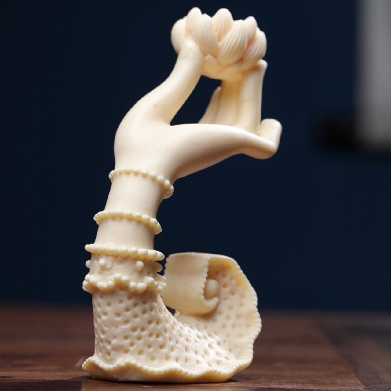 象牙果の素材が持つ温かみのある白い色合いは、浄化や清らかさを象徴し、空間に穏やかなエネルギーをもたらします。オフィスやリビングに飾ることで、心の平穏と落ち着きを呼び込み、静かな力強さを感じることができるでしょう。また、蓮の花を持つ手の姿は、内面の成長を大切にする精神性を表現しており、見る人々に深い印象を与えるでしょう。