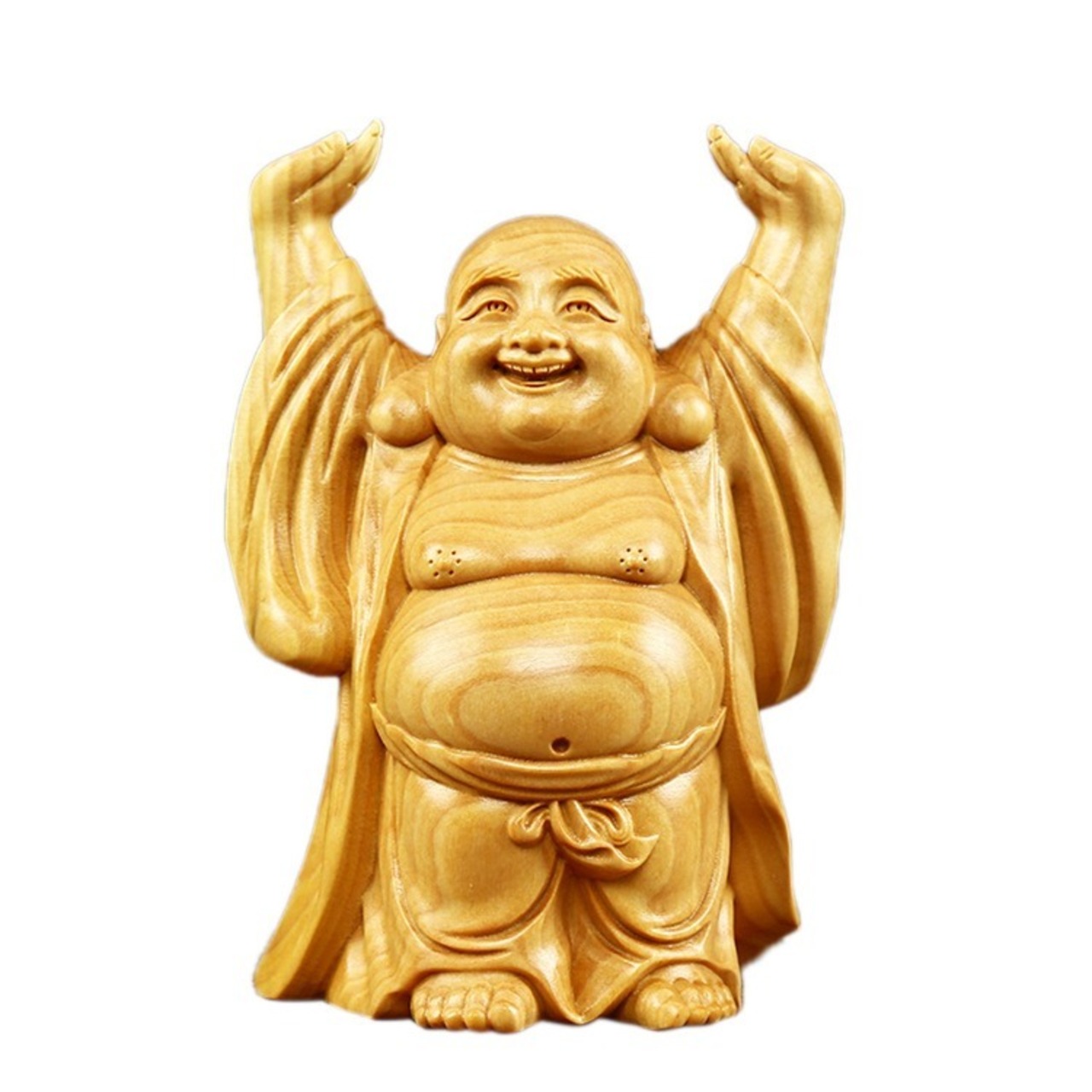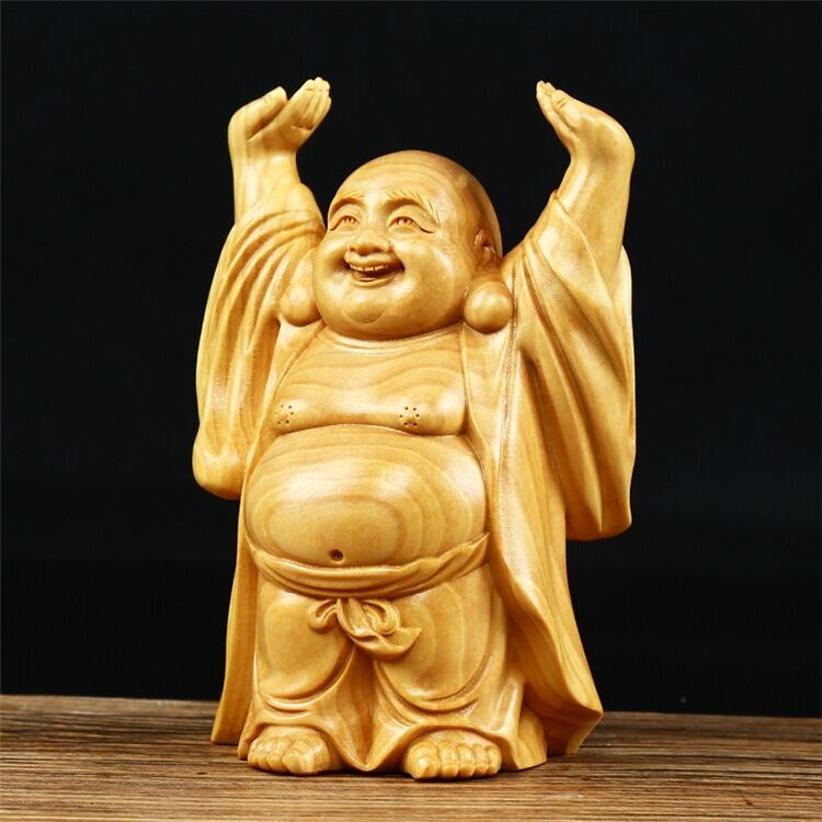 この木製の布袋様置物は、自然の木材が持つ温かみのある質感と、職人による細部までこだわった彫刻が魅力です。木目の美しさと丁寧な仕上げは、見ているだけで心が安らぎ、インテリアとしても上品なアクセントとなるでしょう。