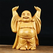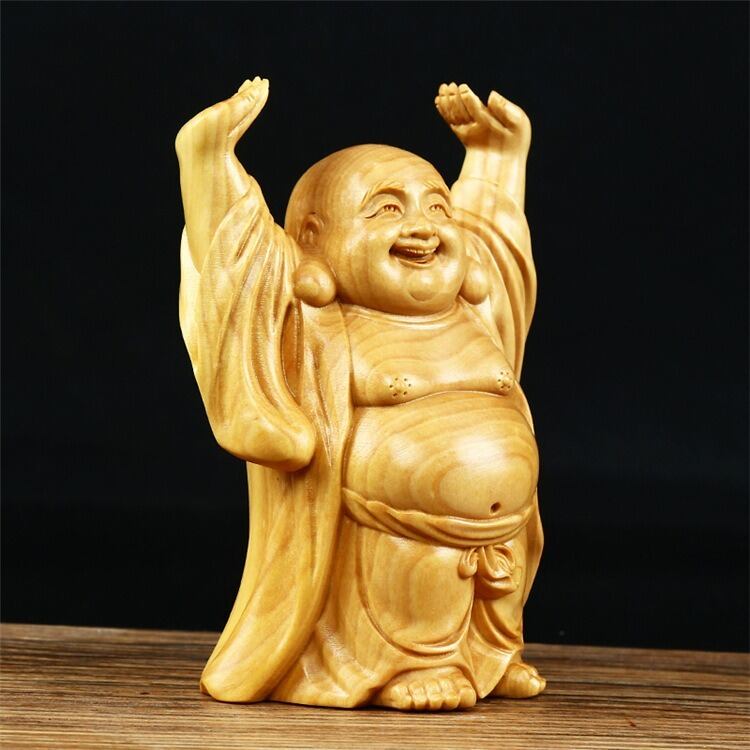 布袋様は、七福神の一柱として広く親しまれ、富や幸福、そして笑顔をもたらす象徴として信仰されています。その満面の笑顔と大きな袋を持つ姿は、豊かさと満足感を象徴し、人々の生活に明るいエネルギーをもたらす存在とされています。特に両手を挙げた布袋様の姿は、願いが叶うことや運気が上昇することを願うポーズとして人気があります。