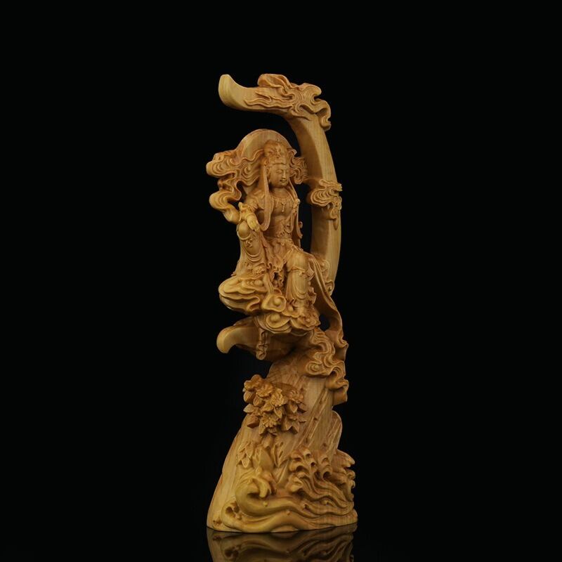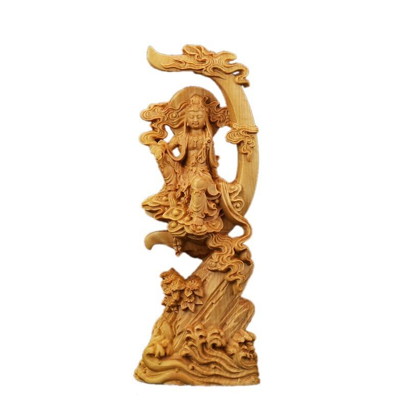 本商品は、天然木材を使用し、一つひとつ丁寧に彫刻された木製の水月観音置物です。木の温かみと職人の技が織りなす繊細なディテールが、神秘的な美しさを引き立てています。その落ち着いた佇まいは、リビングや寝室、瞑想スペースに自然と調和し、空間に穏やかなエネルギーをもたらします。