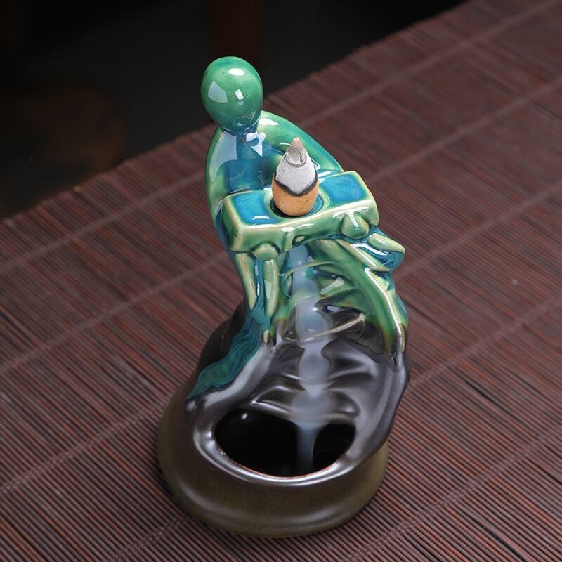 香炉としての機能はもちろん、焚かれた香が立ち上る煙が僧侶を包み込むような演出が空間を浄化し、安らぎの雰囲気を生み出すかもしれません。深みのある青色は、心を落ち着け、清らかさを感じさせるカラーリングで、モダンなインテリアにも調和します。