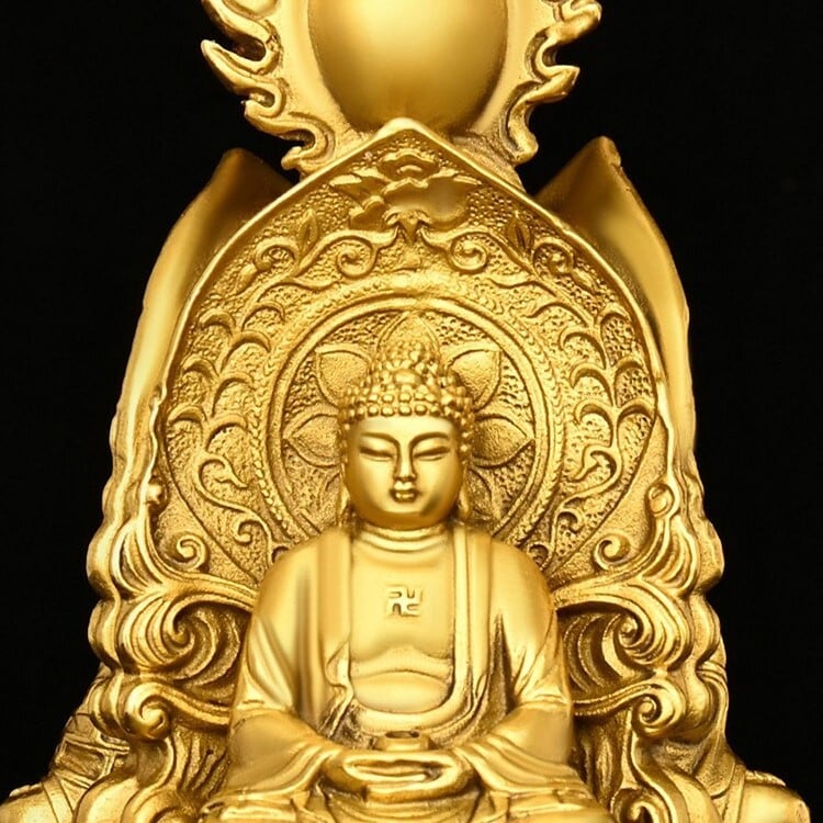 金色の仕上げは、繁栄や幸運を引き寄せると信じられており、風水でも高く評価されています。特に金色は、財運や人間関係の良好さを促進すると考えられ、家庭やオフィスに置くことでポジティブなエネルギーを呼び込むとされています。また、釈迦牟尼はその智慧と慈悲深さにより、心の安らぎや困難を乗り越える力をもたらすと信じられており、このオブジェを飾ることで、日々の生活に安定と調和をもたらすかもしれません。
