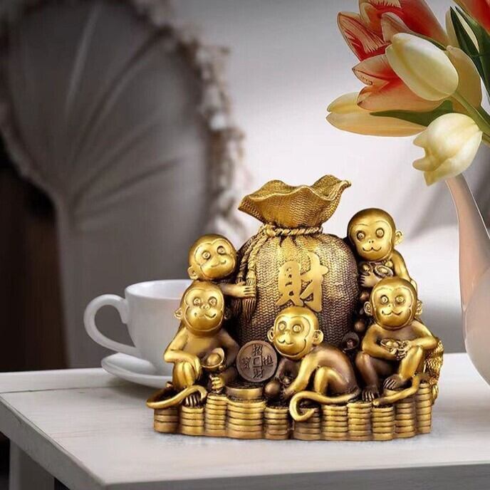 繁栄と財運を象徴する非常に縁起の良いオブジェです。猿は古くから東洋の文化で「知恵」や「機転」を象徴し、また「五福」をもたらす存在として信仰されています。特にこのオブジェの5匹の猿は、財を象徴するお金の袋の周りに集まり、その袋からは幸運や繁栄を引き寄せるとされています。金色の輝きは、風水において富を呼び込む力があると信じられており、金運を高めるための理想的なアイテムです。
