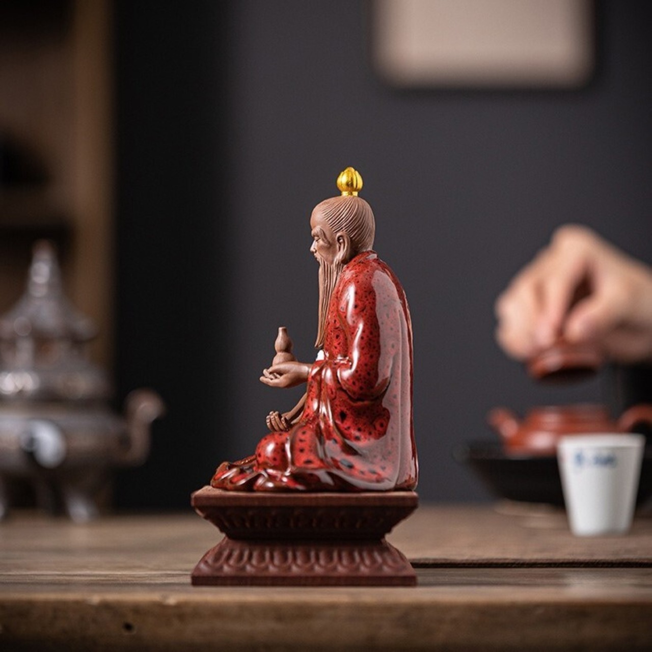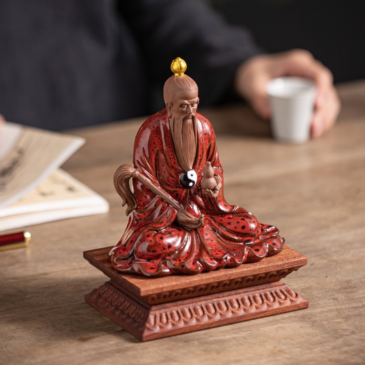道教の宇宙観における重要な神格の一つを象徴する、美しい赤色が印象的なオブジェです。太上道君は、万物の調和と統一を司る存在として崇められ、心身の平穏や繁栄、家庭の和を願う多くの人々に信仰されてきました。この置物は、古来の教えに基づく象徴性を持ちながら、現代の空間に馴染む洗練されたデザインに仕上げられています。